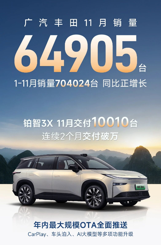 12月5日,广汽丰田2025年11月销量数据正式发布:单月售出64905辆,较上年同期的67493辆微降3.8%;但1-11月累计销量达704024辆,实现同比正增长。在国内新能源汽车渗透率已突破49%的行业背景下富深所,这份成绩单看似平淡,实则藏着结构性增长的强劲势能,新能源车型的爆发式表现,正成为广汽丰田穿越市场周期的核心支撑,而其在智能化赛道的前瞻布局,更彰显出长久的市场竞争力。